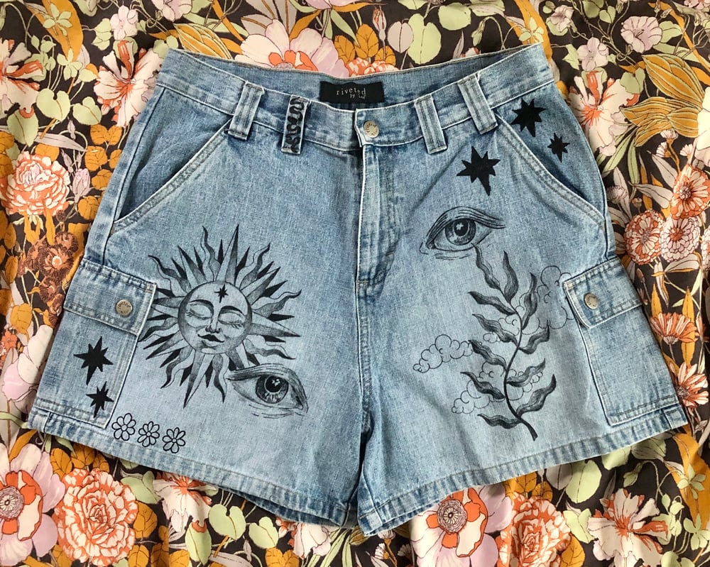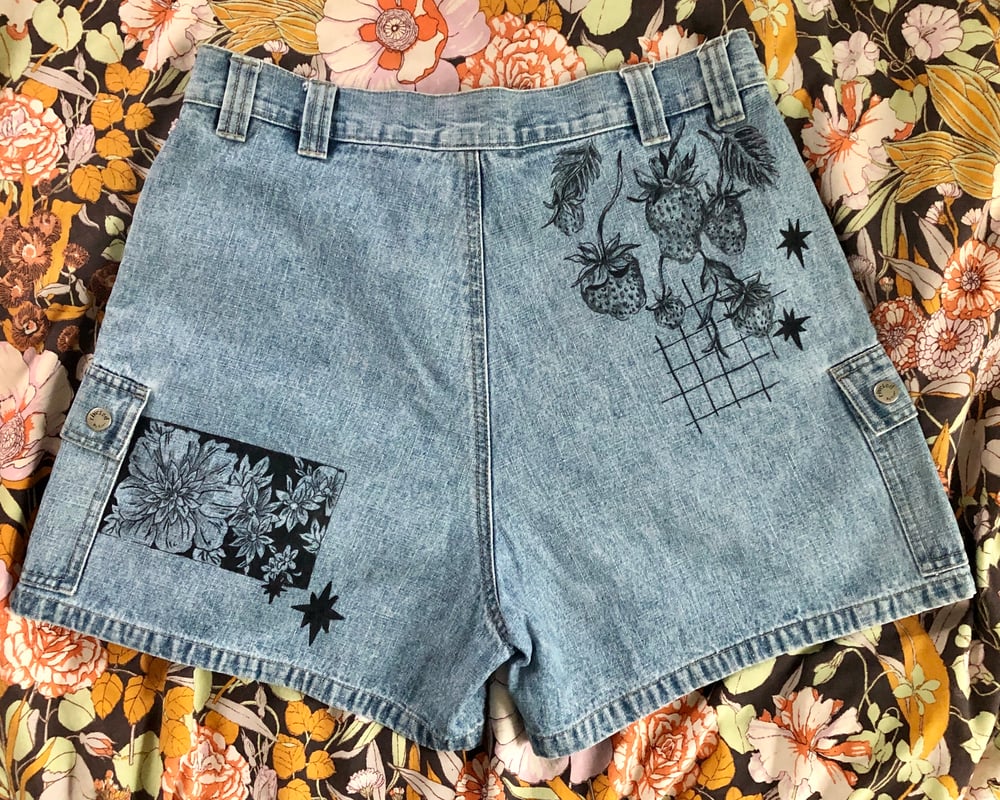 The Beatrix shorts were hand drawn with fabric pens. All of the art is heat set for durability and to prevent bleeding or chipping.