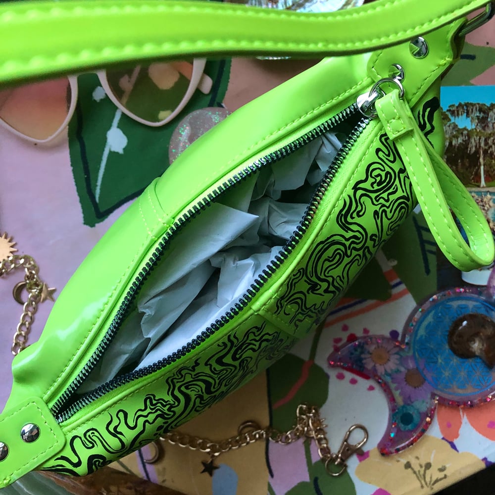 The Hanlon purse is a brand new, hand-painted purse made from lime green vegan leather. The shoulder strap is adjustable, and long enough to comfortably wear over the shoulder or can be shortened to use as a handbag.